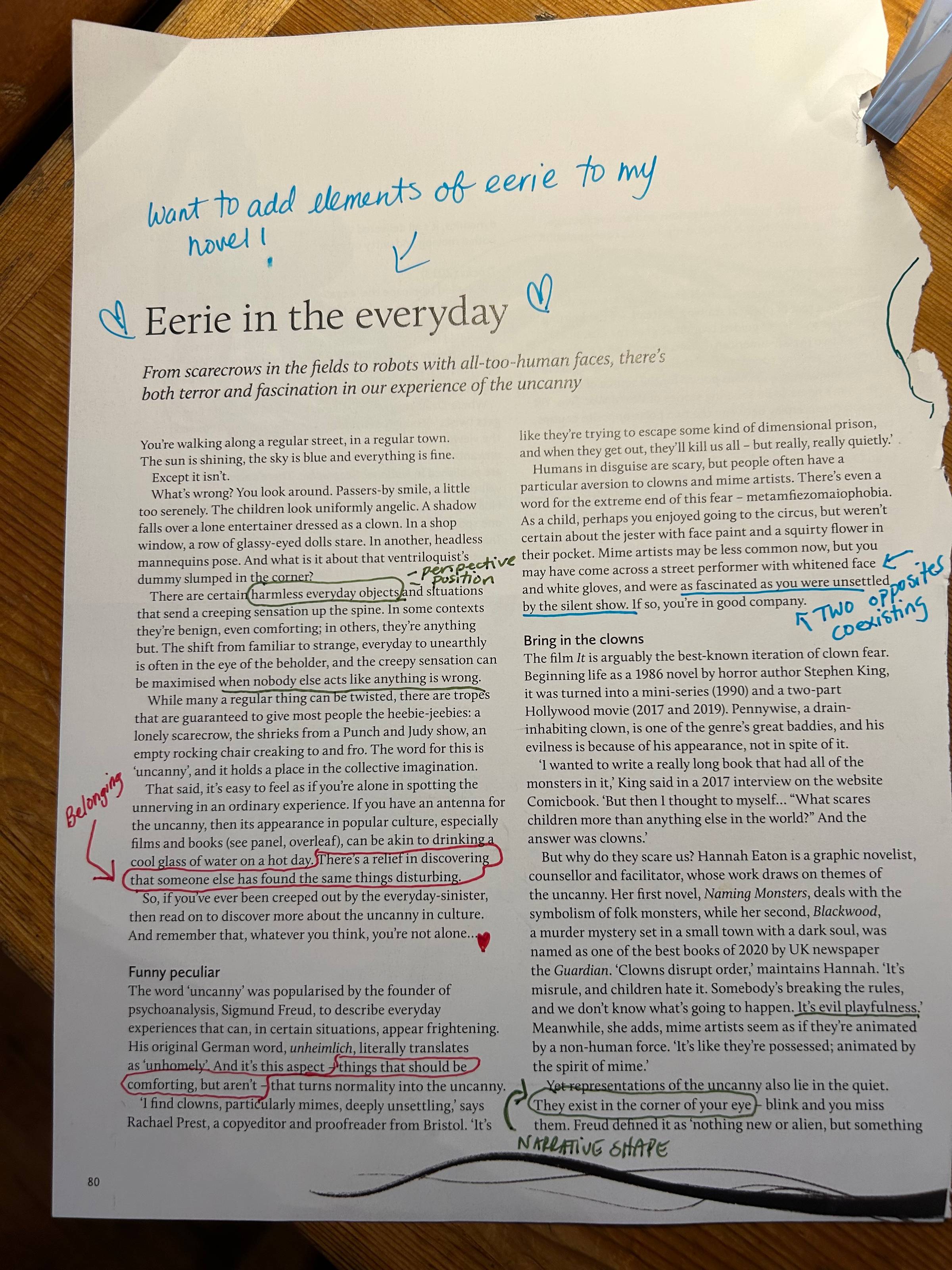 I tore the article out and scrawled a note to myself at the top: “I want to add elements of eerie into my novel.” The curiosity. The pulse of mystery. The reminder that when we stop creating for a moment, we make space for wonder to enter.